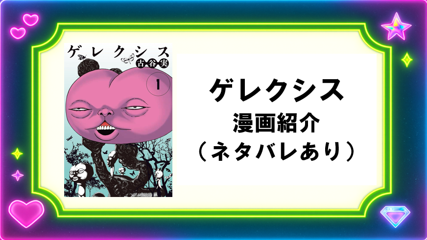 以上、『ゲレクシス』の紹介でした。笑ってゾワッ、なのに先が読めない——この“バグった現実”感がクセになる。古谷実の毒はちゃんと効いてるのに、読み味は軽やか。全2巻でサクッと完走できて、余韻はじわっと長持ち。『稲中』『ヒミズ』は知ってるけど別ラインも攻めたい人にこそおすすめ。ちょっとでも気になったら、読んでみてね👻